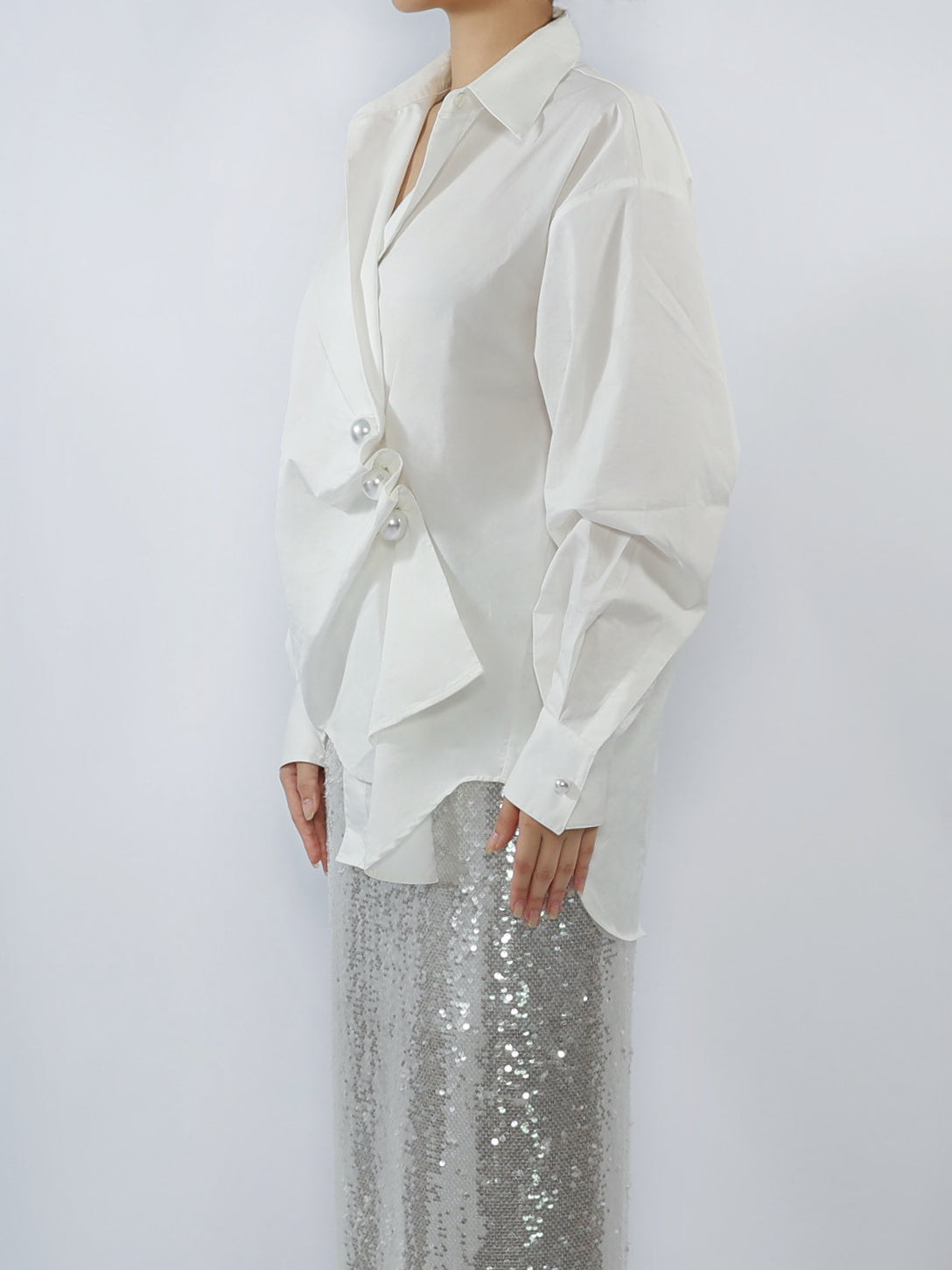 This elegant white button-up shirt featuring a unique asymmetric design. The shirt showcases an artistic front drape, adorned with oversized pearl buttons that add a touch of sophistication. Its long sleeves are finished with subtle pearl-accented cuffs, enhancing the overall luxurious feel. Perfect for both formal occasions and chic casual wear, this shirt pairs beautifully with skirts or tailored trousers, offering versatility and timeless elegance in one stylish piece.